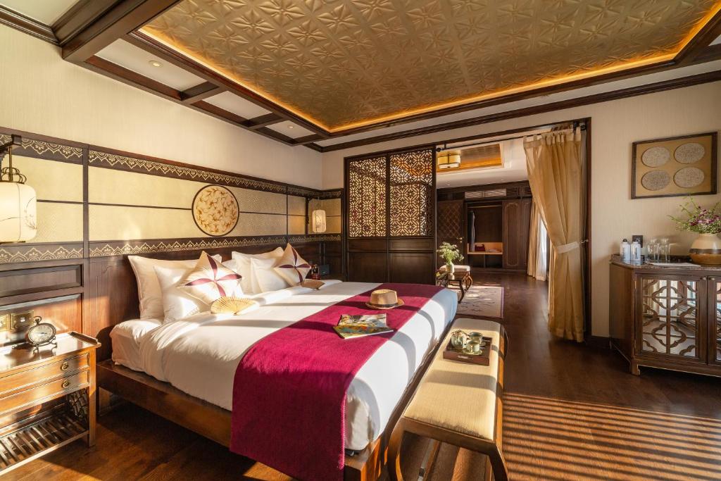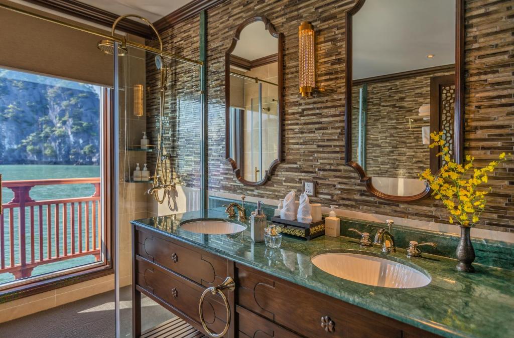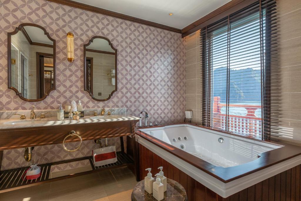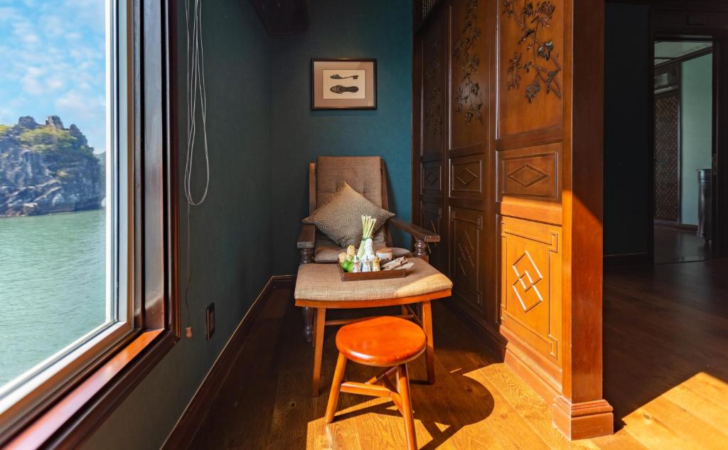 Each suite is a haven of serenity, featuring soft natural tones, private balconies, elegant bathrooms, and panoramic windows that open to breathtaking seascapes. Guests can unwind in the onboard pool, sauna, or jacuzzi, or indulge in a rejuvenating spa treatment inspired by traditional Vietnamese herbs.