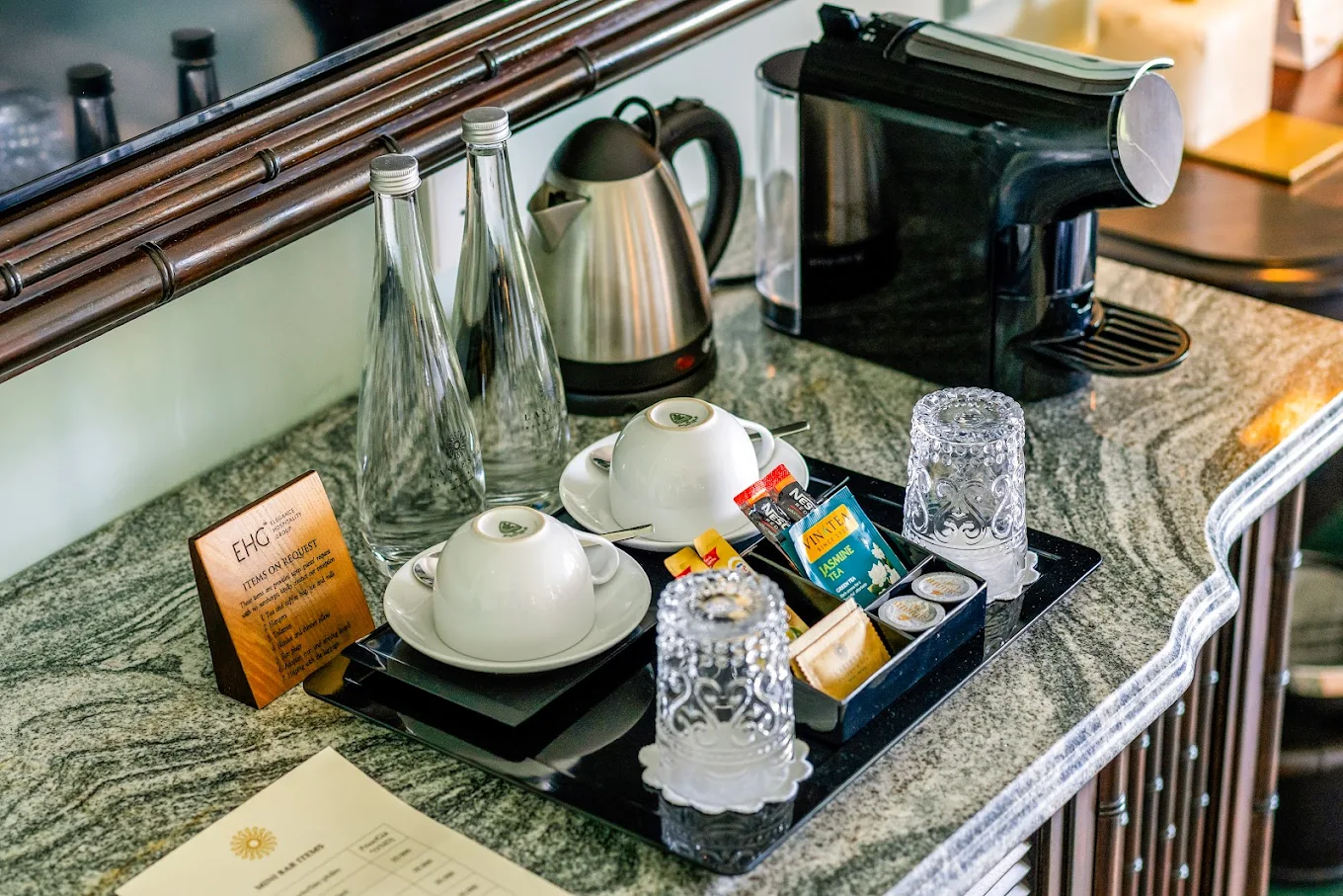 Each room and suite at La Siesta is thoughtfully designed with warm wooden tones and contemporary furnishings, creating a soothing sanctuary of comfort. All rooms come equipped with air conditioning, a work desk, tea and coffee facilities, a flat-screen TV, a personal safe, and a private bathroom with premium amenities, a bidet spray, and fresh linens.