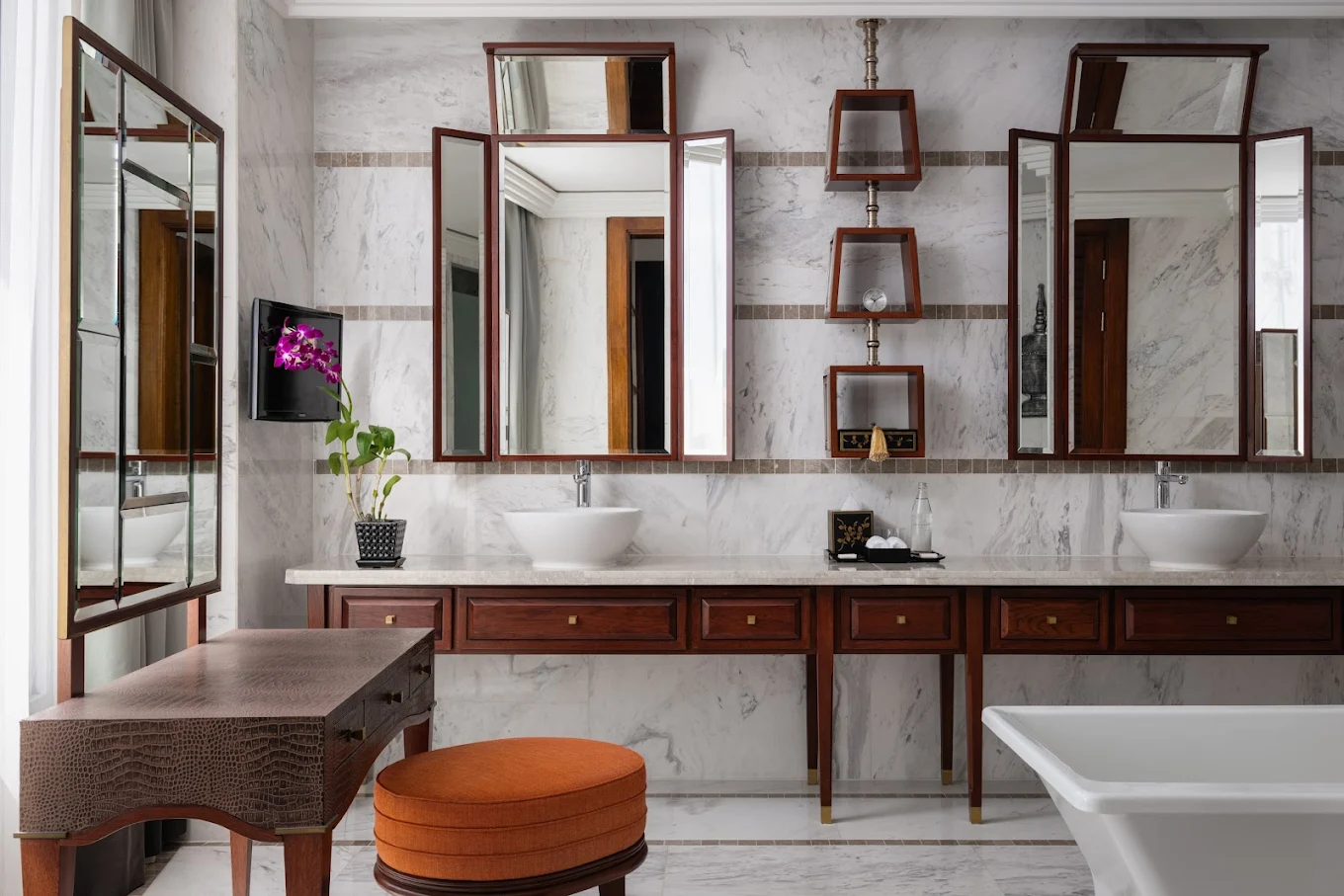 Each air-conditioned room overlooks either the city or the hotel’s serene courtyard. Interiors combine bespoke furnishings with Khmer-inspired design, enhanced by Italian marble bathrooms, double vanities, and premium amenities such as Nespresso coffee machines and daily refreshed tropical fruit baskets.